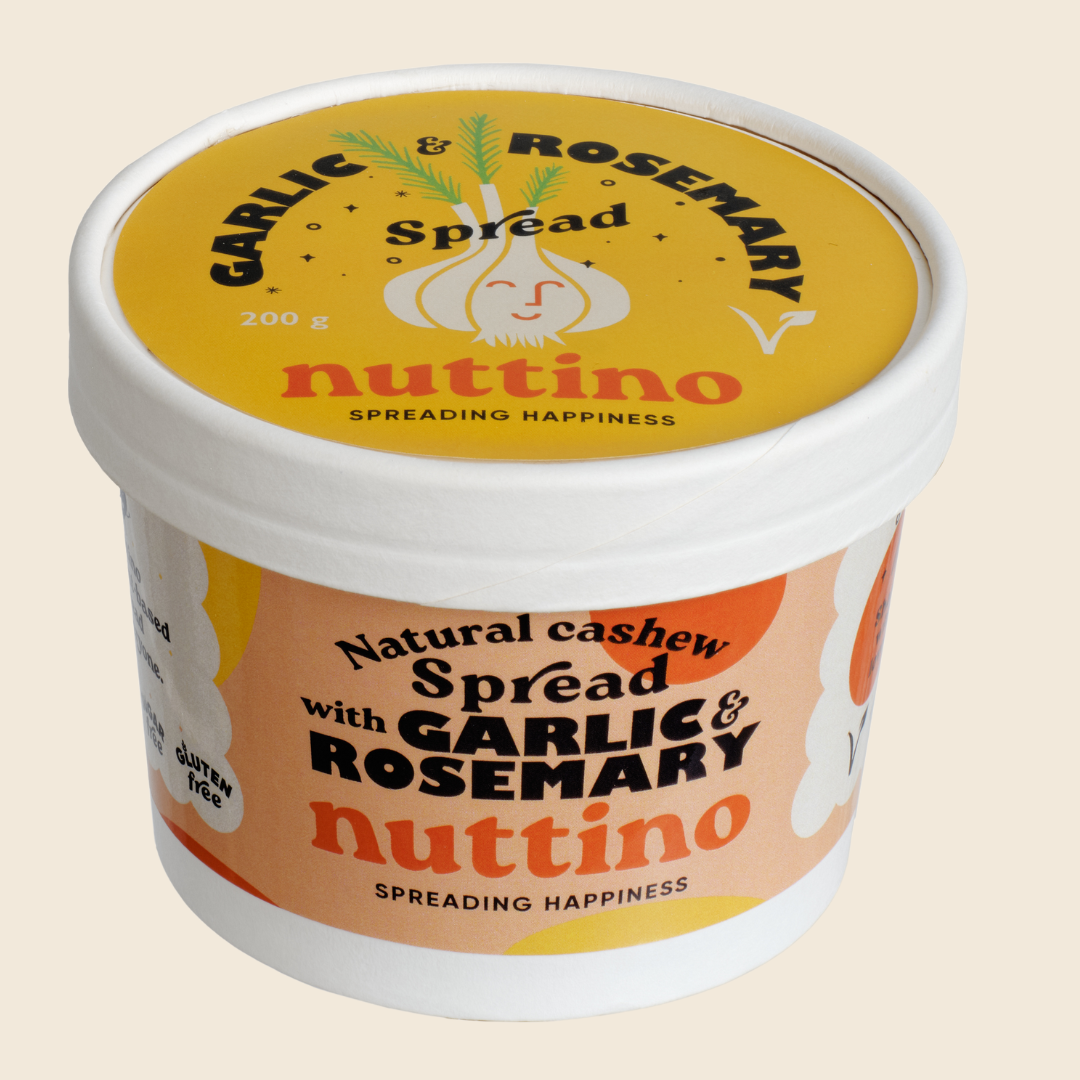 Nuttino is about spreading love and happiness through tasty and healthy plant-based products suitable for everyone. The Nuttino garlic & rosemary spread has a delicious Mediterranean taste. The texture is smooth and mouthwatering. This Nuttino spread is a great source of essential nutrients, vitamins, protein and fiber. Share a bite with your loved ones. Did you know that rosemary has benefits such as improving memory and digestion, while garlic acts as an immune booster? Try our spread as a pasta sauce or on your favorite crackers!