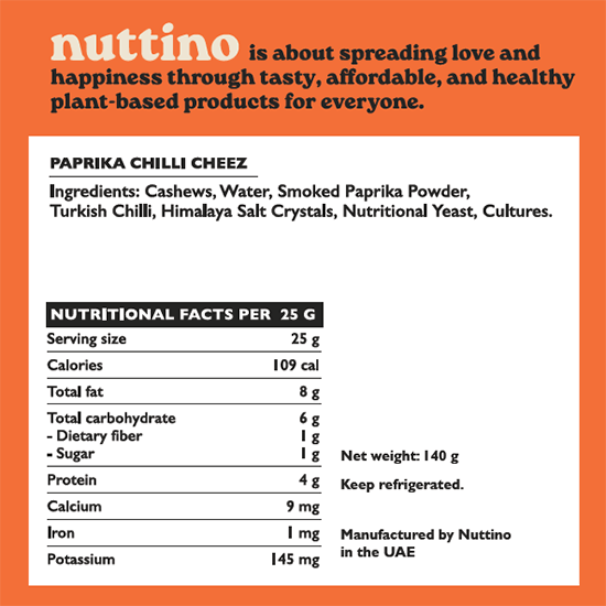 Nuttino is about spreading love and happiness through tasty and healthy plant-based products suitable for everyone. The Nuttino paprika chili cheez has a delicious smokey and creamy taste. The texture is smooth and mouthwatering. This Nuttino cheez is a great source of essential nutrients, vitamins, protein and fiber. Share a bite with your loved ones. Did you know paprika peppers have seven times more vitamin C than oranges? Try it out in our smoky blend, Nuttino paprika chili cheese.